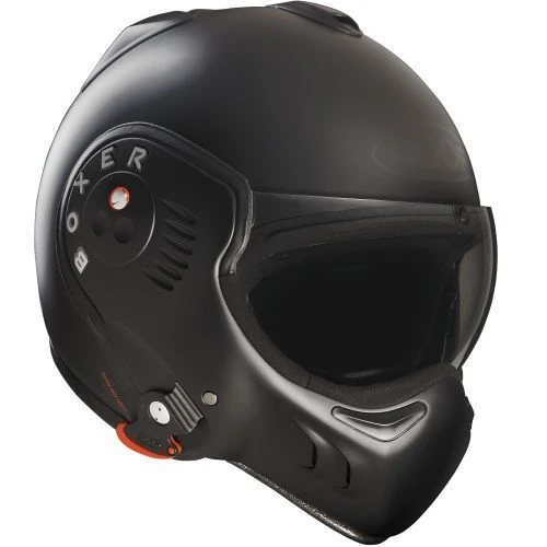 De ROOF Boxer V8 Full Black is razend populair onder de custombike, chopper en nakedbike rijders en is daarbij ook de bekendste motorhelm onder de motorrijders. De Boxer V8 is te dragen als jet- of als integraalhelm. Daarnaast is deze unieke motorhelm met duivelse rode oortjes gemaakt van glasvezel. Een glasvezel helmschaal is licht van gewicht en ijzersterk en daarmee geniet je van een langere levensduur dan de gemiddelde motorhelm. De rode clipjes aan de zijkant zorgen ervoor dat het kinstuk niet zomaar open kan schieten. Druk de rode clipjes in en het kinstuk kan los worden geklikt zodat je hem volledig naar achter kan klappen. Het voordeel hiervan is dat je geen wind vangt. Het vizier is achter het kinstuk geplaatst zodat het vizier niet mee naar achter klapt wanneer je open rijdt met de helm.